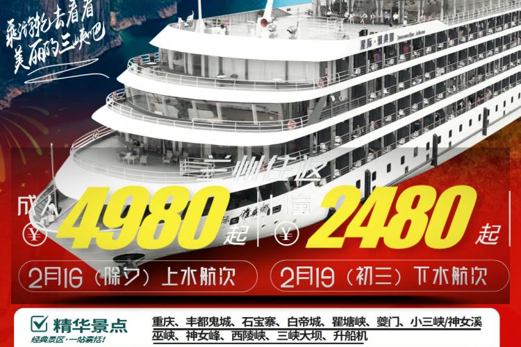 4. 本行程仅供参考,具体以游轮说明会为准。如遇升船机检修,则更换为三峡人家风景区(290元/人)