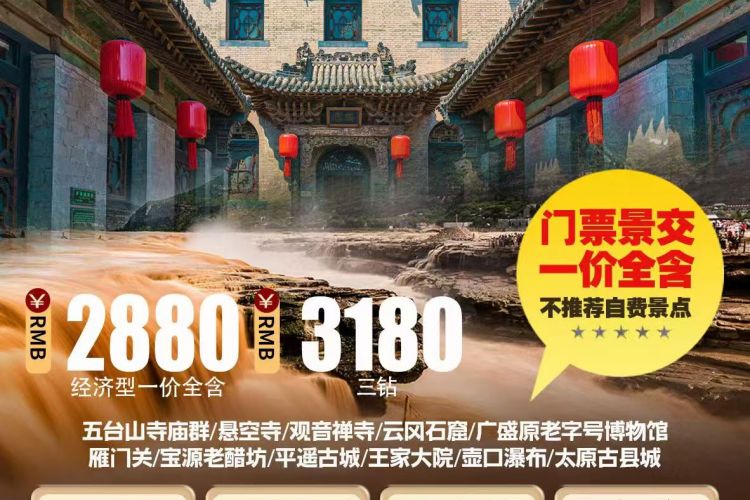 含景点首道大门票(云冈石窟、悬空寺首道、五台山、王家大院、壶口瀑布、雁门关、平遥古城自由行不含平遥套票)